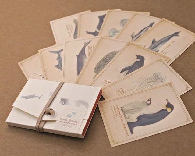くらげやクジラなどが大きな海でゆったりと漂う姿、海の中を覗いたような癒やしの空間。図鑑をめくると自分の知らない新しい世界に出会えそう、そんなワクワク感を込めたカードです。 ひとつひとつ柄が違うカードが紙製の専用ケースに入っています。それぞれの学名、科目、和名がローマ字で添えられているので、図鑑のような雰囲気を楽しめます。 お気に入りのカードをフレームに入れてインテリアとして飾ったり、そのまま押しピンで留めて、並べてコレクションするのもおすすめです。 裏面は真っ白で、メッセージカードとしてお使いいただけます。大切な方への贈り物に添えたり、お土産やプレゼントにもおすすめです。 *カードには、繊細な風合いで優しい手ざわりの「アラベール」という用紙を使用しています。ナチュラルで品があり、紙本来の質感を楽しむことができます。 *箱の内側ケースには「レザック80つむぎ」という用紙を使用しています。優美な紬の質感を表現したエンボスが魅力です。 《モチーフ:海の生き物》12種類の絵柄 アデリーペンギン、ジンベエザメ、ザトウクジラ、ハンドウイルカ、ミズクラゲ、ゴマフアザラシ、オニイトマキエイ(マンタ)、コウテイペンギン、ギヤマンクラゲ、カマイルカ、シャチ、アオウミガメ 《内容量》1ケース12枚入 《サイズ》カード:8cm×5.5cm、ケース:6cm×8.5cm 《重 さ》20g 素材:紙 生産国:日本
