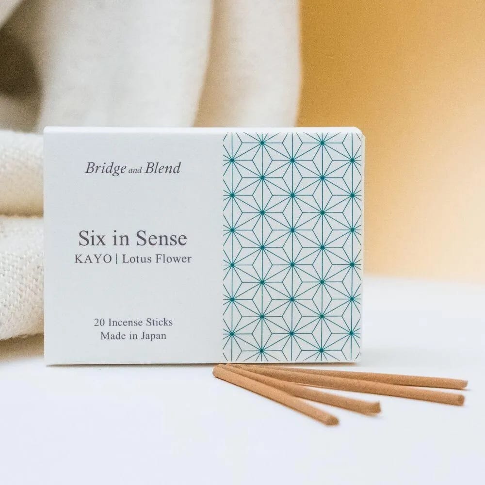 源氏物語に登場する香り Six in Sense—KAYO は、1000 年前の調合からインスピレーションを得た蓮の花をイメージした初夏のお香です。